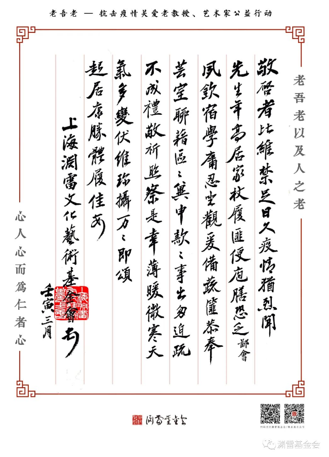 接下来,我们将继续推进【老吾老】公益行动,通过线上申请、线下统筹的方式惠及更多需要帮助的老教授、艺术家们。同时,我们也呼吁社会爱心人士共襄善举,积极助力公益行动,为抗击疫情、守护家园贡献力量!